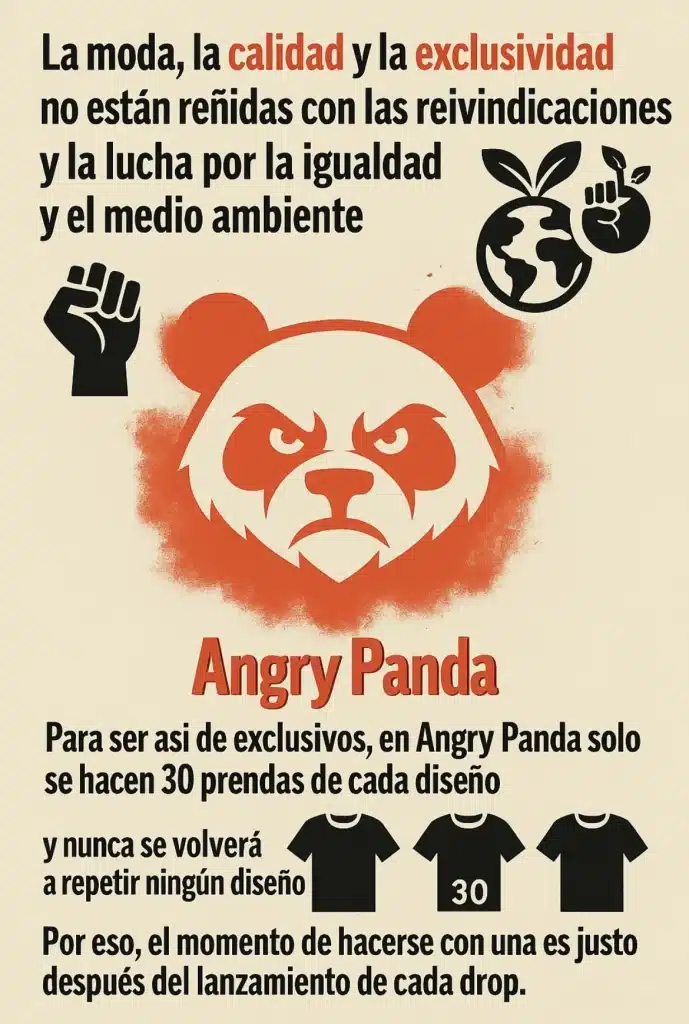 Queremos ser un símbolo de rebeldía positiva que nos reúna, puente entre culturas y generaciones, para construir un futuro común. Angry Panda transforma cómo consumimos moda: prioriza la sostenibilidad, el activismo y la defensa de los derechos humanos.